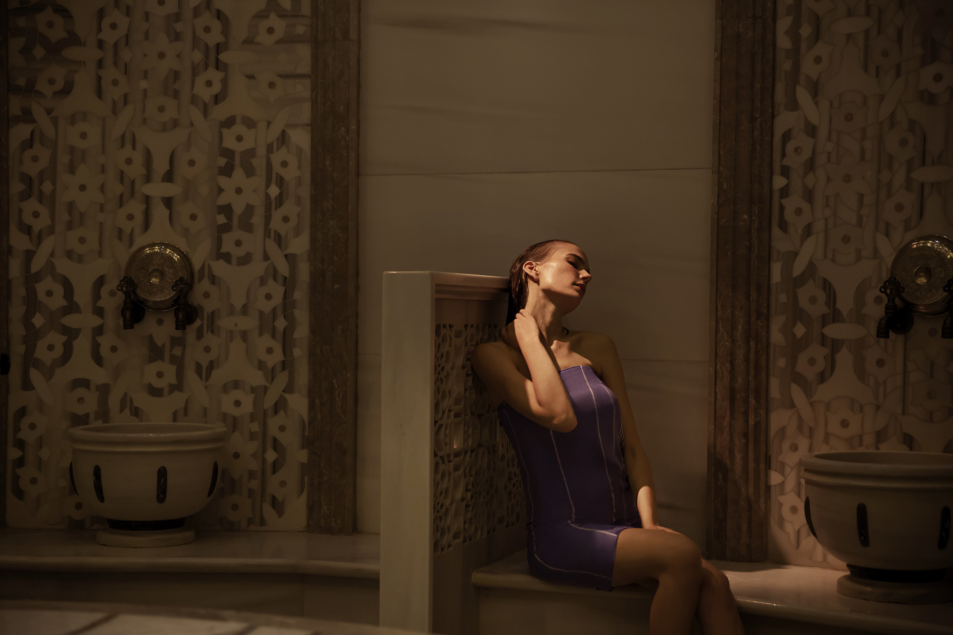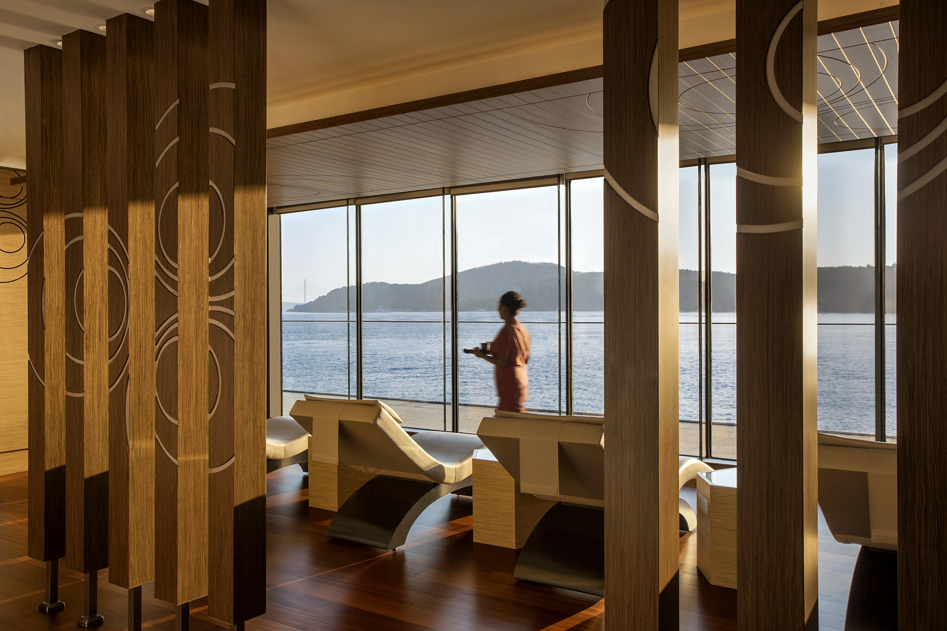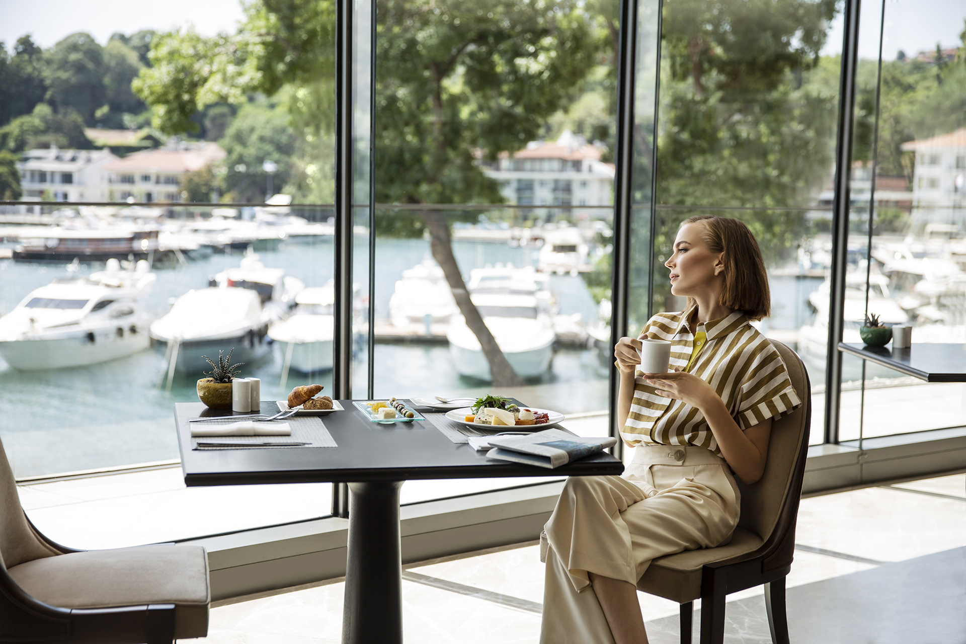 Mimarisi, Boğaz'ın "görkemi" (Çırağan gibi) ile değil, "zarafeti" ile diyalog kurar. Tecrübemle, benim mimari fotoğrafçı gözüm, modellerimizin o "zarafeti" yaşayacağı "sahneyi" aradı. Denize sıfır o teraslar, o ikonik kıvrımlı balkonlar... Bunlar, bir "mimariden" çok, "sinematik bir sahneydi".